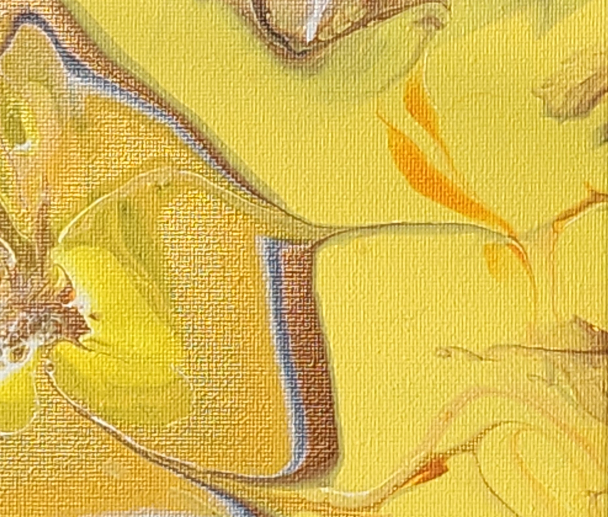 Dynamic abstract, one-of-a-kind, 100% hand-painted acrylic painting featuring yellows and copper on 10x10 stretched canvas with matte finish.